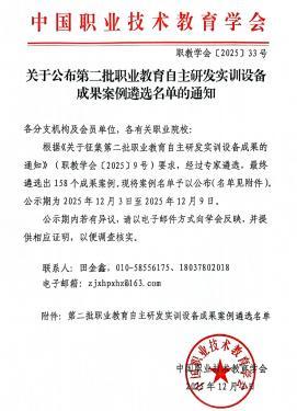 中国职业技术教育学会在2025年职业教育自主研发实训设备成果案例遴选工作中,公布了2025年职业教育自主研发实训设备成果第一批、第二批及第三批案例遴选名单。全国约180所职业院校374项案例入选。WilliamHill中文官网赫焕丽、谢承等教师团队研发的6项成果成功入选,入选数量位居全国第七,湖北省第二,充分体现了公司在自主创新与实训教学改革方面的显著成效。