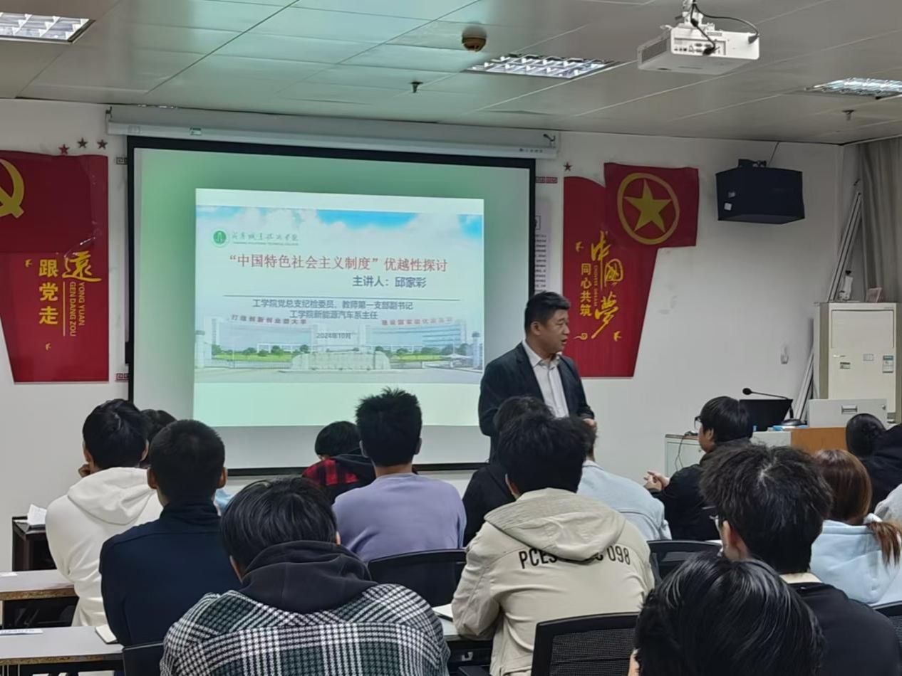 工公司党总支纪检委员邱家彩与学员们一起探讨“中国特色社会主义制度”优越性探讨,深入分析了中国特色社会主义制度在促进社会公平正义、保障人民民主权利、推动经济发展等方面的显著优势。结合实际案例详细阐述了制度如何在不同领域发挥作用,以及如何在实践中不断完善和发展。