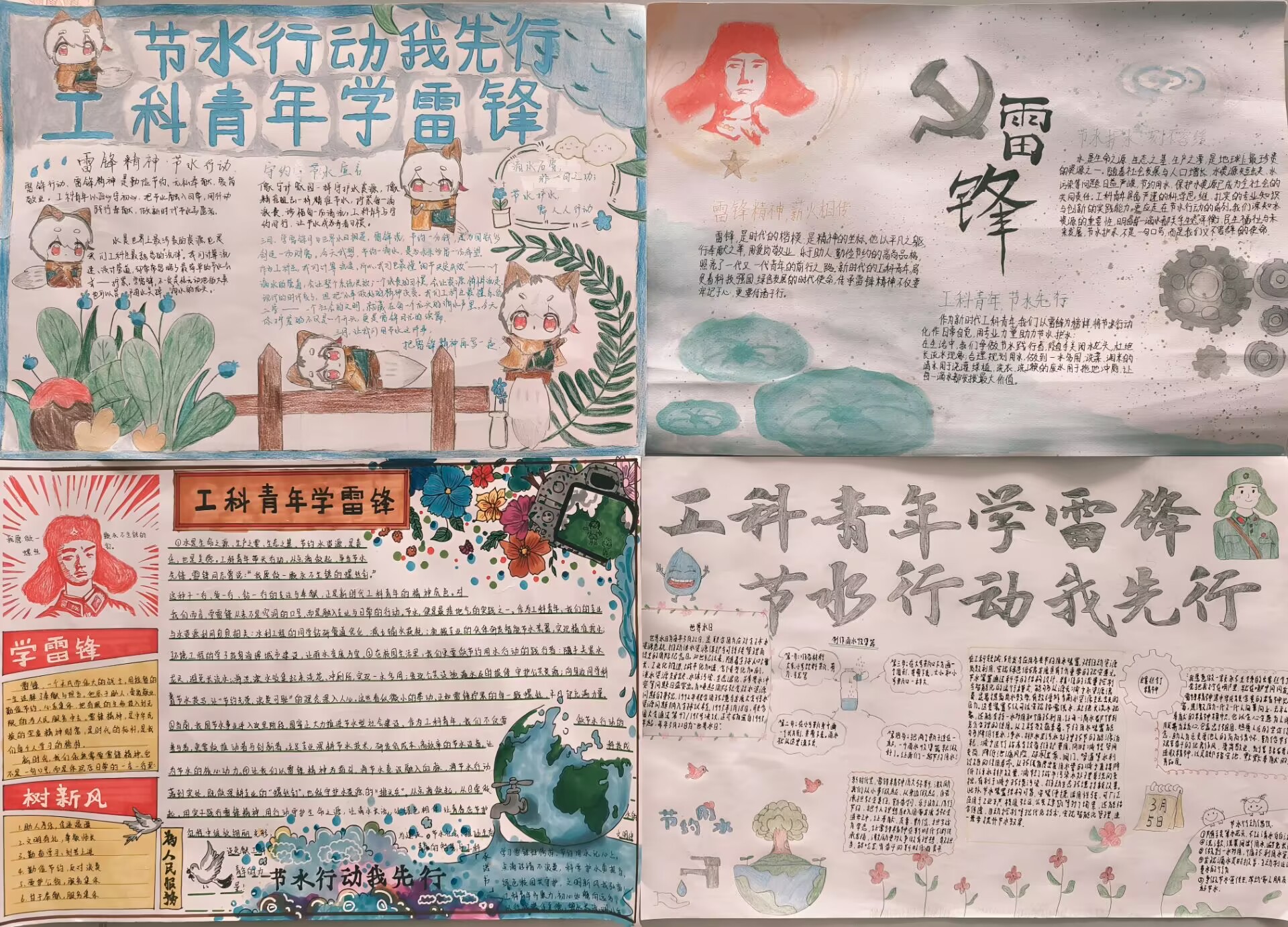 活动启动后,同学们利用课余时间精心构思、认真创作。作品围绕雷锋事迹、奉献精神、节水知识、护水倡议、校园节能等内容展开,版式新颖、图文并茂,既有对雷锋同志无私奉献精神的深情致敬,也有对水资源保护、科学用水、随手关水等文明习惯的生动宣传。一幅幅色彩鲜明、主题突出的手抄报,既展现了工科学子的审美与创意,也传递出“节约每一滴水、争做文明先锋”的青春态度。