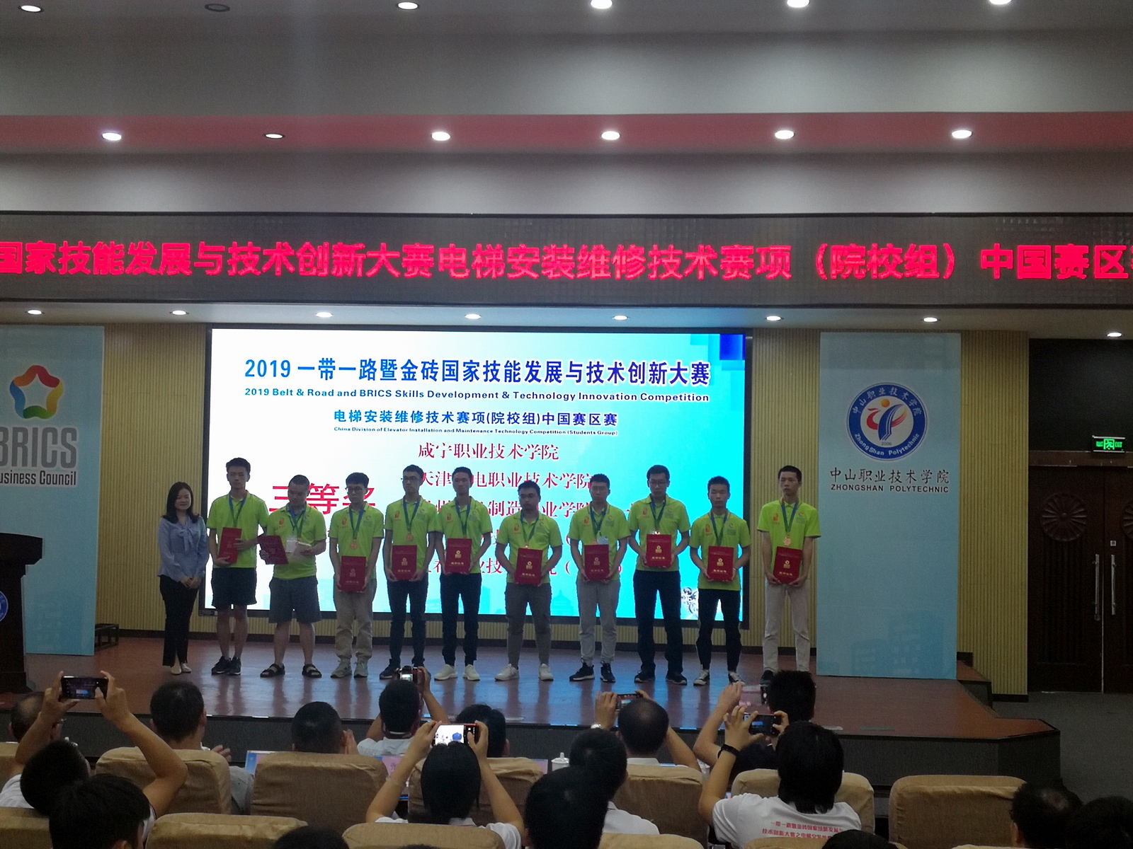 9月22日至9月27日2019一带一路暨金砖国家技能发展与技术创新大赛----电梯安装维修技术赛项在广东中山职业技术公司举行。此次活动有来自韩国、老挝及全国各地共49支代表队的98名选手参加了比赛,公司WilliamHill中文官网员工代表队荣获“电梯安装维修技术”赛项三等奖。